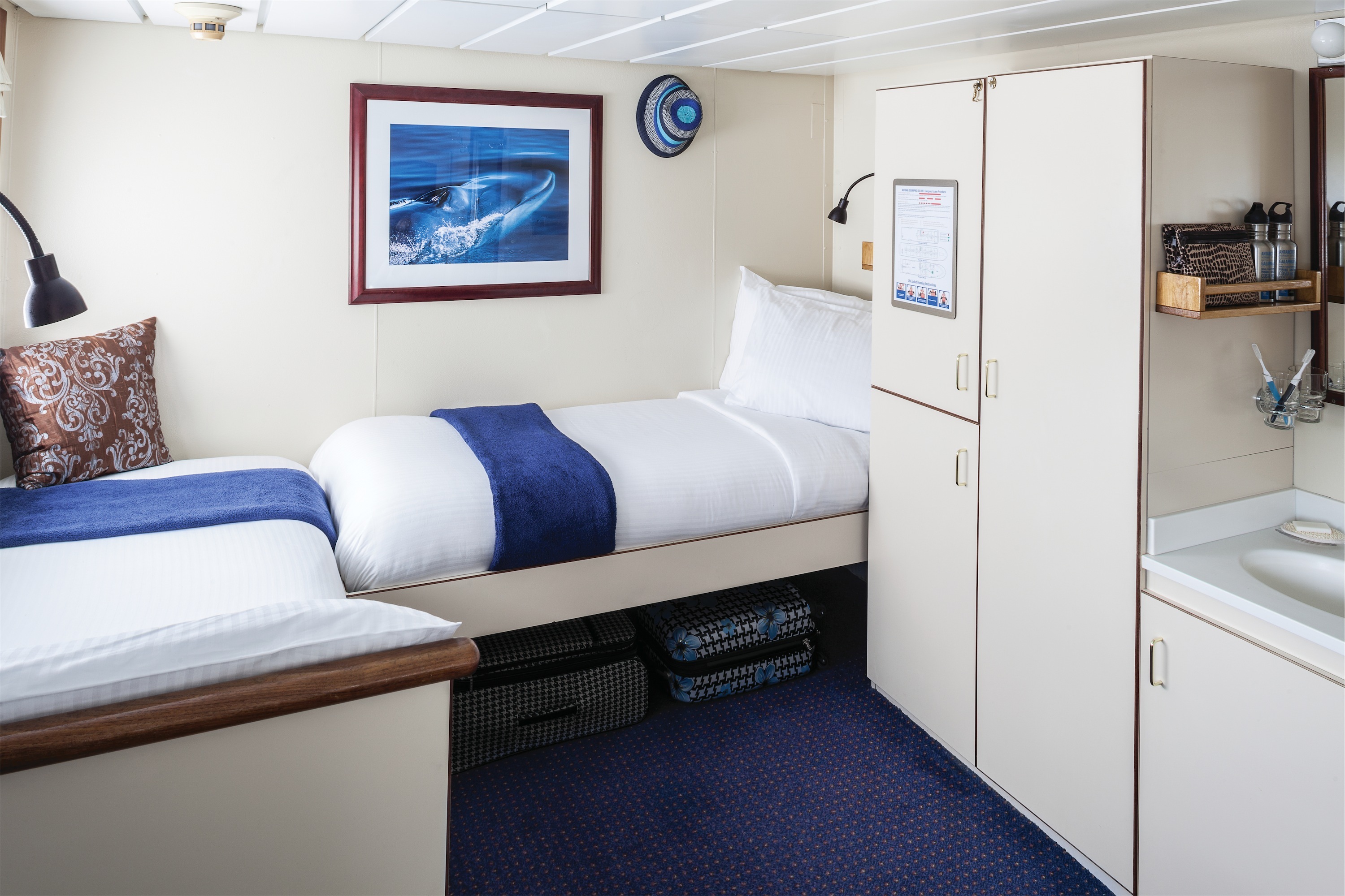 Conveniently positioned between the dining room and lounge, these cabins feature two single beds, a writing desk and a large view window. All cabins benefit from private facilities and climate controls.