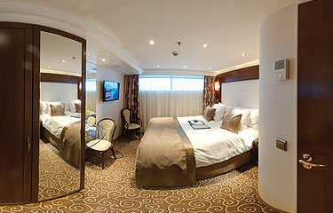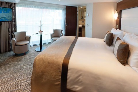 Elegantly designed 225 sq. ft. cabins Bed size: 62 inches X 77 inches (with optional twin-bed configuration) 400 thread count cotton linens\duvets filled with 90% hypoallergenic down\pillows filled with 100% Hungarian goose down, memory foam pillow also available One floor-to-ceiling French Balcony (98 inches wide x 75 inches high) with one sliding door that opens, plus a 98 inch x 37.5 inch fixed window Large bathroom with marble counters, double sinks, larger showers with rainfall shower heads, enhanced lighting, and under-sink storage space Molton Brown toiletries – a Tauck Exclusive Terry-cloth bathrobe plus slippers Coffee maker plus refrigerator stocked with complimentary water and soft drinks replenished daily 32” LED TV 220v and 110v outlets in cabin and bathroom Built-in closets and drawers Easy under-bed luggage  storage Telephone, safe and individual climate control 2 chairs and table Onboard wi-fi available