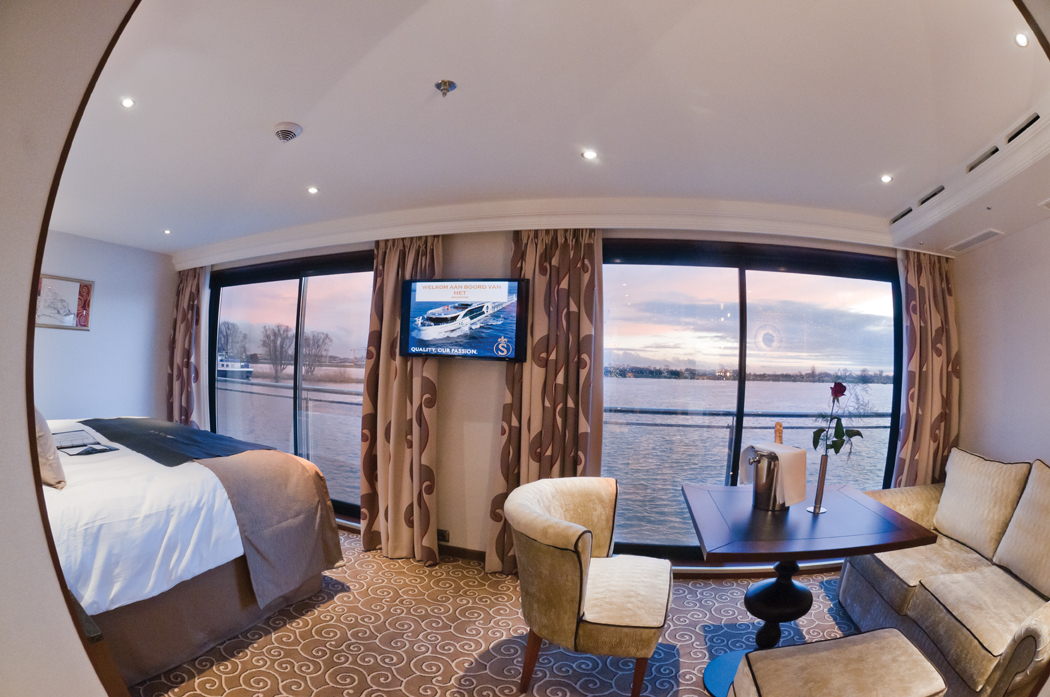 Innovatively designed 225 sq. ft. split level cabins that extend from the first to the second deck, providing guests with an additional view Bed size: 62 inches X 77 inches (with optional twin-bed configuration) 400 thread count cotton linens\duvets filled with 90% hypoallergenic down\pillows filled with 100% Hungarian goose down, memory foam pillow also available Window is 98 inches by 114 inches and can be partially opened. Large bathroom with marble counters, double sinks, larger showers with rainfall shower heads, enhanced lighting, and under-sink storage space Molton Brown toiletries – a Tauck Exclusive Terry-cloth bathrobe plus slippers Coffee maker plus refrigerator stocked with complimentary water and soft drinks replenished daily 32” LED TV 220v and 110v outlets in cabin and bathroom Built-in closet with drawers Easy under-bed luggage  storage Telephone, safe and individual climate control 2 chairs with table Onboard wi-fi available