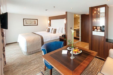 Elegantly designed 300 sq. ft. suites Bed size: 62 inches X 77 inches (with optional twin-bed configuration) 400 thread count cotton linens\duvets filled with 90% hypoallergenic down\pillows filled with 100% Hungarian goose down, memory foam pillow also available Two floor-to-ceiling French Balconies, each 98 inches wide x 75 inches high each with one sliding door that opens Triple & quad cabin made possible by pullout couch (quads for children only) Large bathroom with marble counters, double sinks, large showers with rainfall shower heads, enhanced lighting, and under-sink storage space (note: no bathtub) Molton Brown toiletries – a Tauck Exclusive Terry-cloth bathrobe plus slippers Coffee maker plus mini-bar stocked with complimentary water and soft drinks replenished daily 32” LED TV Breakfast room service Walk-in closet with built-in shelves Iron plus ironing board 220v and 110v outlets in cabin and bathroom Couch, two club chairs & coffee table, plus a desk Easy under-bed luggage  storage Telephone, safe and individual climate control Onboard wi-fi available