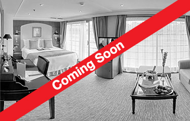 These 14 luxurious Category 7 suites on the Diamond Deck feature a double bed with optional twin-bed configuration with 400 thread count cotton linens/white duvets and pillows of mako cotton with hypoallergenic 90% down filling. The large marble bathroom a separate shower and bathtub, as well as Molton Brown toiletries and a terry-cloth bathrobe plus slippers. The suites also includes two floor-to-ceiling French Balconies with a sliding doors, a coffee maker and mini-bar stocked with complimentary water and soft drinks replenished daily. Amenities also include a 32” LED TV, a pull-out couch, two club chairs & coffee table, a desk, a TV credenza, a walk-in closet and dresser, as well as a telephone, safe, and individual climate control.Each also benefit from quad cabin layout, made possible by pullout couch (only for children), breakfast room service, iron and ironing board and onboard Wi-Fi.