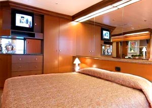 Picture window, two lower beds can convert to queen size. Direct dial, ship-to-shore telephone service, television, hair dryer, safe deposit box and mini-bar in every stateroom.