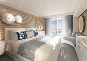 Area : 38 m² Capacity :up to 2 passengers per cabin 8m² private balcony Individually-controlled air-conditioning King-size bed or twin beds Shower Minibar Flat screen Satellite TV Desk with stationery Ipod(TM) players Video on demand Safe Hairdryer Bath robes Satellite direct line telephone 110/220 volts outlet French bath products 24hr room service Internet access wifi.