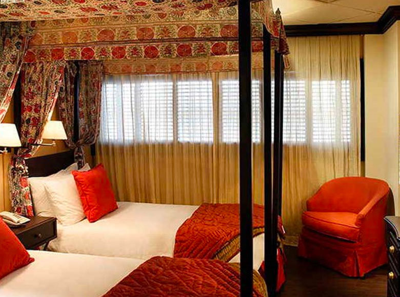 The 14 luxury cabins are all beautifully appointed with old fashioned four poster beds, draped with Egyptian linens. The shutters are the traditional focal point of the cabin and are a striking design element. The warm colours of the cabin and traditional tones evoke the glamour of the 1930s.
