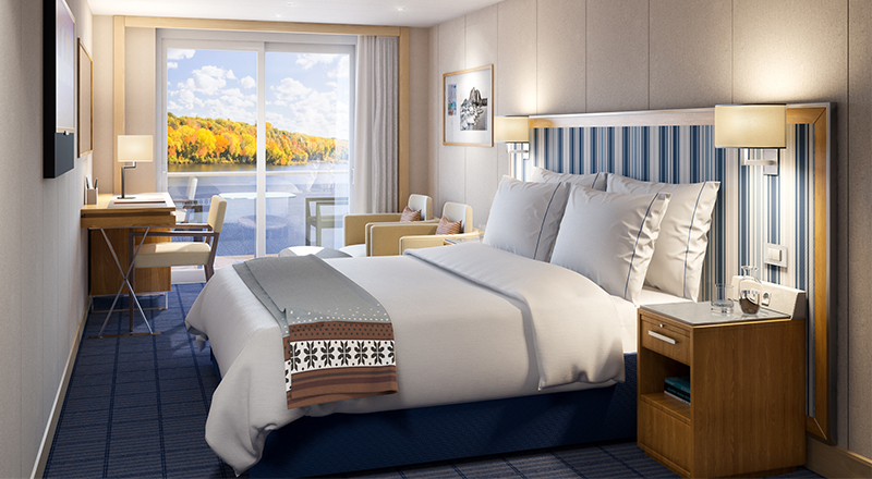 Stateroom size: 268 sq ft (includes private veranda)River-view stateroom with floor-to-ceiling sliding glass door opening to full-size veranda12 PM Embarkation2 PM stateroom accessKing-size Viking Explorer Bed (optional twin-bed configuration) with luxury linens & pillowsFree Wi-Fi (connection speed may vary)42" flat-screen LCD TV with intuitive remote & complimentary Movies On Demand110/120 volt US-standard outlets & USB portsPrivate bathroom with spacious glass-enclosed shower, heated floor, anti-fog mirror & hair dryerPremium Freyja® toiletriesPlush robes & slippersTelephone, safe, refrigeratorIndividual climate controlPurified water refilled dailyMini-bar with soft drinks, water & snacksBinocularsTraditional Norwegian Marius-weave blanketPersonal coffee machine with premium coffee & tea selectionsStateroom steward & twice-daily housekeeping24-hour room serviceUnder-bed suitcase storage spaceRoomy wardrobe with wooden hangers