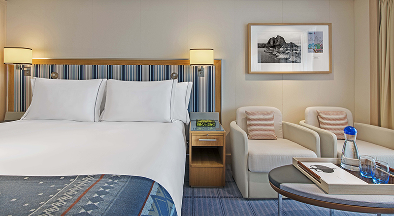 Stateroom size: 400 sq ft (includes private veranda)River-view suite with floor-to-ceiling sliding glass door opening to a full-size veranda12 PM Embarkation12 PM priority stateroom accessKing-size Viking Explorer Bed (optional twin-bed configuration) with luxury linens & pillowsFree Wi-Fi (connection speed may vary)42" flat-screen LCD TV with intuitive remote & complimentary Movies On DemandAdditional 42" flat-screen interactive LCD TVs in living area110/120 volt US-standard outlets & USB portsLarge private bathroom with spacious glass-enclosed shower, double-sink vanity, heated floor, anti-fog mirror & hair dryerPremium Freyja® toiletriesPlush robes & slippersTelephone, safe, refrigeratorIndividual climate controlPurified water refilled dailyWelcome bottle of champagneMini-bar with alcoholic beverages, soft drinks, water & snacks (replenished once daily)BinocularsTraditional Norwegian Marius-weave blanketPersonal coffee machine with premium coffee & tea selectionsStateroom steward & twice-daily housekeeping24-hour room serviceComplimentary laundry & shoe shine servicesUnder-bed suitcase storage spaceRoomy wardrobe with wooden hangers