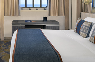 Located: Deck 3 Occupancy: Single  183 sq. ft. of total living space Panoramic ocean view from the full picture window Queen bed  Elegant private bath featuring L'Occitane products, a walk-in glass shower with rain head, body jets and a handheld shower, and a single wardrobe Sitting area with two chairs, side table, flat-screen TV and state-of-the-art "infotainment" system