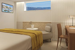 PANORAMA SUITE 200 sq. ft. SAPPHIRE, ROYAL DECK CATEGORY A, B, P ROOM FEATURES Elegant, contemporary design Wall-to-Wall Panoramic Window with Open-Air Balcony Comfort Collection Beds Luxurious mattress toppers Egyptian super-combed cotton linens European-style duvets Soft & firm pillows Extra blankets Choice of bed configuration One Queen-Sized Bed or Two Twins Nightly turn-down service Bedside tables with reading lamps Spacious 3-door closets with shelves for ample storage Full-length mirror Easy under-bed luggage storage Flatscreen satellite TV with English-speaking channels & over 100 free movie options Direct-dial telephone Well-stocked minibar Complimentary filtered water In-room safe Individual climate control Bathrobes & slippers Full shower with glass door Lighted makeup mirror Marble countertops in bathroom Hairdryer L'Occitane bath products 6-person sitting area Writing desk and chair Sofa Coffee table Complimentary Wi-Fi USB Ports