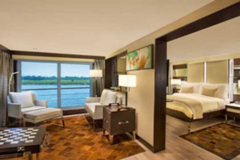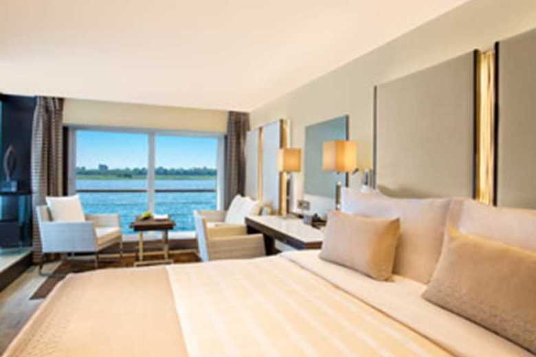 Built in 1996, she was extensively reconfigured in 2015 with just 22 cabins and luxurious amenities, including an Oberoi spa. Windows are nearly floor to ceiling and slide open, offering a connection with the river. The topmost deck has a swimming pool that is the largest of any Nile ship and an alfresco restaurant. Downstairs, there’s a stylish enclosed restaurant serving local specialties as well as more continental options.