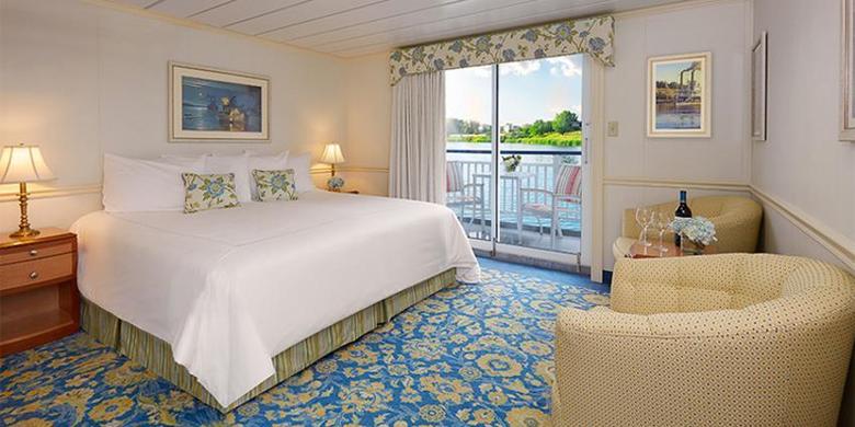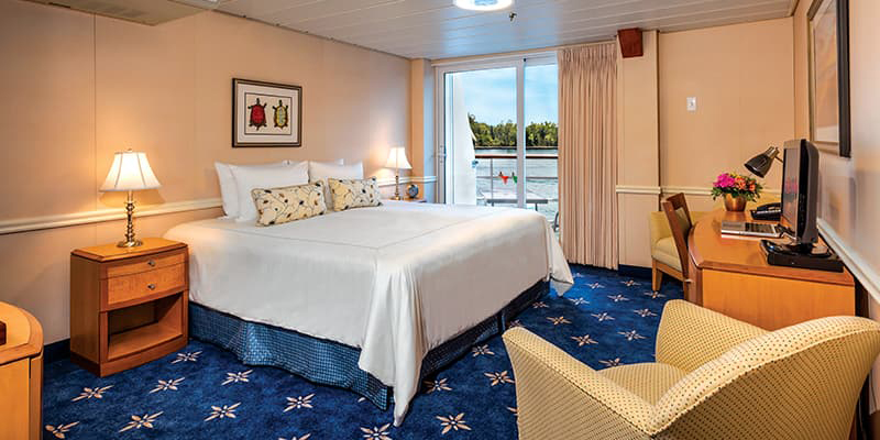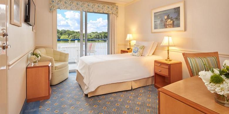 SB1 staterooms on the main deck offer complete comfort with approximately 275 sq. ft. of living space. Enjoy a full-size bathroom, large picture window, and door leading out to a furnished private balcony. These staterooms also feature a large sitting area, ideal for getting together with friends.