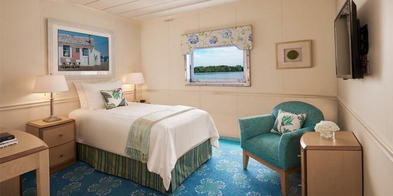 A comfortable getaway, our Single staterooms offer individuals a spacious room with convenient amenities. At 203 sq. ft., all have interior entrances and large viewing windows where the sights of the Mississippi can be enjoyed.