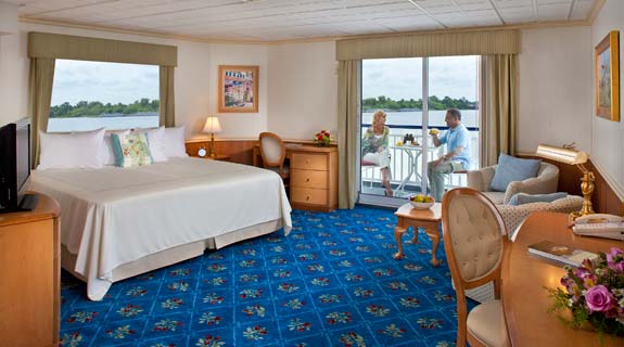 Located on the top deck, these spacious staterooms feature scenic views of the passing landscape. At 328 sq. ft., you will enjoy all of the modern comforts that are expected of a premium hotel. These staterooms also offer full-size bathrooms and a walk-out private balcony where the grandness of the Mississippi can be appreciated.